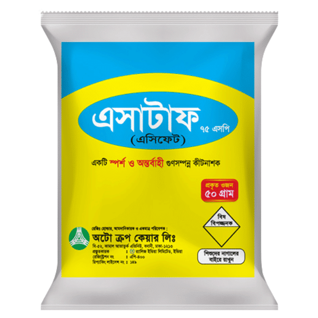 এসাটাফ ৭৫ এসপি একটি উন্নত মানের অর্গানোফসফরাস কীটনাশক যা পোকাদের স্পর্শ এবং গিলে ফেলার মাধ্যমে নিয়ন্ত্রণে সক্ষম। প্রতি কেজিতে ৭৫০ গ্রাম সক্রিয় উপাদান ‘এসিফেট’ সমৃদ্ধ এই কীটনাশক পোকা দমনকারী চাহিদা পূরণে কার্যকর।