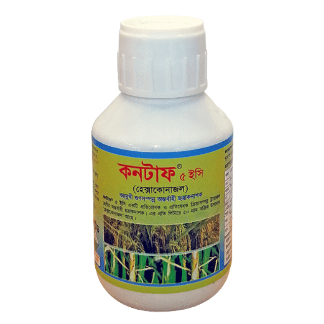 কনটাফ® ৫ ইসি একটি ট্রায়াজল শ্রেণীর প্রতিরোধক ও প্রতিকারক গুণসম্পন্ন অন্তর্বাহী ছত্রাকনাশক। এতে প্রতি লিটারে ৫০ গ্রাম সক্রিয় উপাদান ‘হেক্সাকোনাজল’ বিদ্যমান, যা ফসলের রোগ প্রতিরোধে অত্যন্ত কার্যকর।
